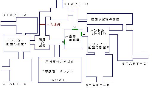 ・水密扉Cから開けた場合、仕掛けはないが、全ての水が1つの扉から溢れ出るため、水流に流されて行き止まりまで戻される